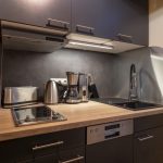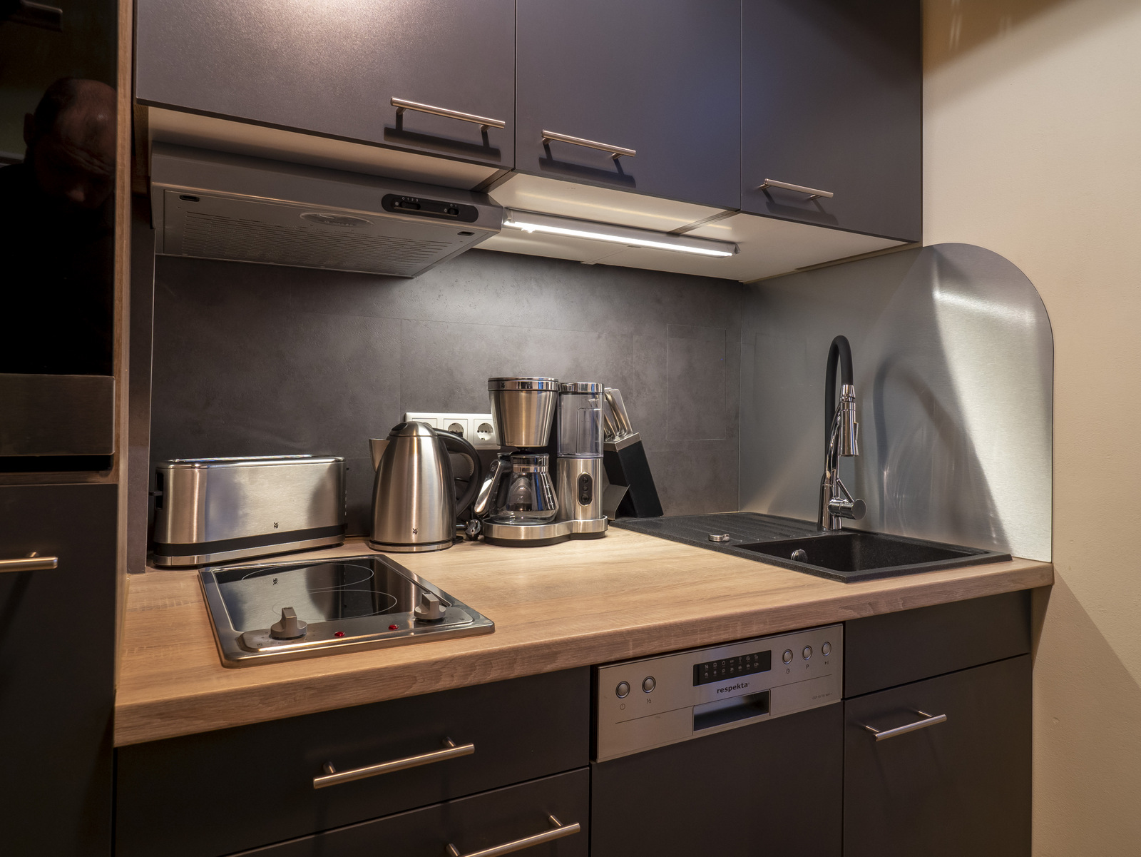 Die kleine Küche ist voll ausgestattet mit einem Kühlschrank mit Gefrierfach, Doppelkochplatte, Backofen, Mikrowelle (Heißluft/Grillfunktion), Toaster, Kaffeemaschine (incl. Filtertüten), Wasserkocher, Geschirrspülmaschine, Spülbecken, Koch- und Essgeschirr, Geschirrtücher, Spülmittel und einer Gewürz-Grundausstattung.