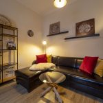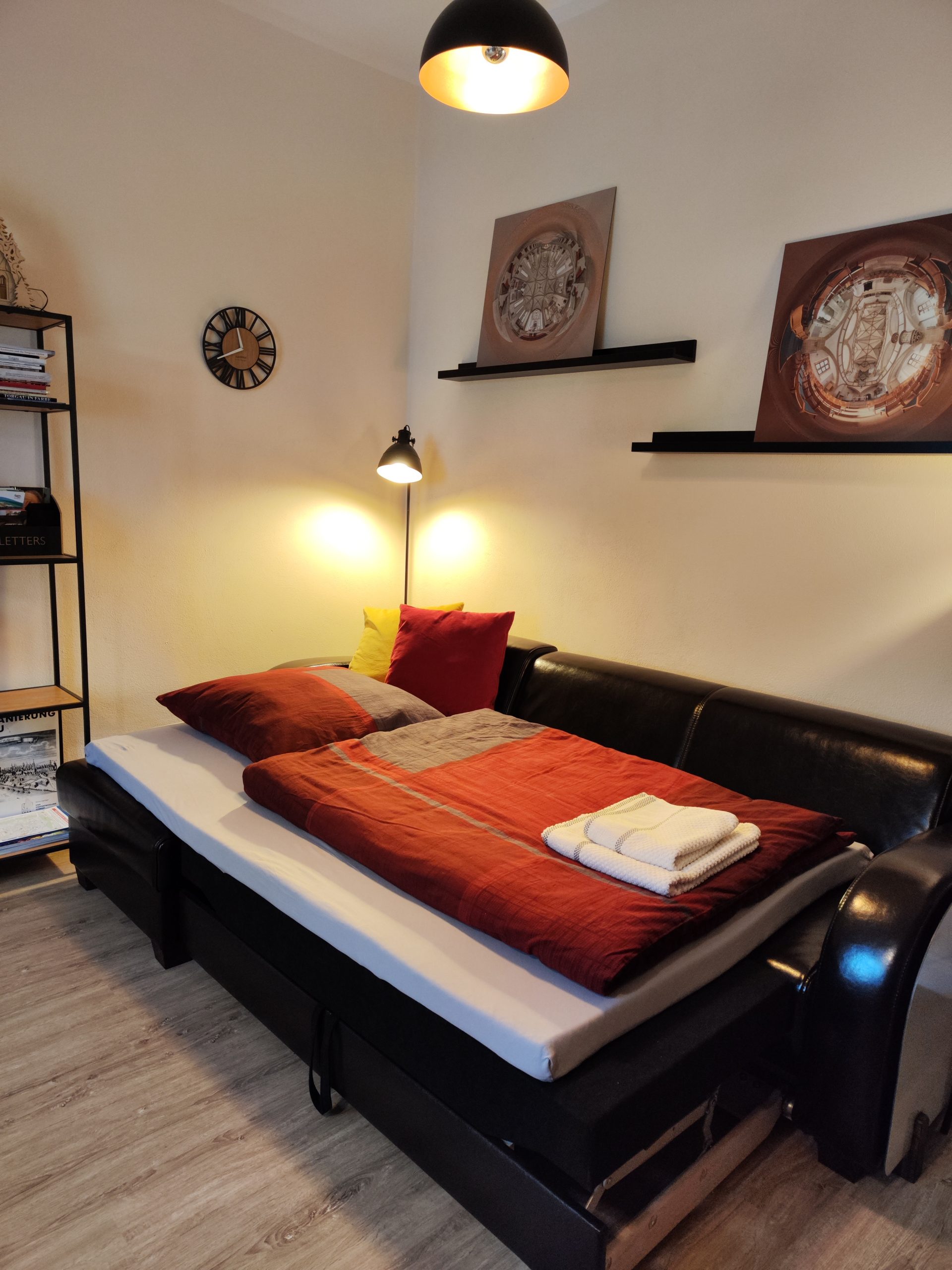 Im großzügigen Wohnraum befindet sich eine bequeme Ledercouch mit Schlaffunktion incl. Matratzentopper (Gel-Schaum) (Liegefläche 1,20 x 2,00 m), ein Esstisch mit 4 Stühlen, ein Kaminofen, ein 50“ UHD TV mit Streamingdiensten, Radio mit CD und DAB+ Empfang. Ein besonderes Detail ist die handgefertigte Garderobe aus Mooreichenholz. Infomaterial, Bücher und Spiele sind ebenfalls vorhanden. Ein kostenfreier Internetzugang über WLAN steht zur Verfügung.