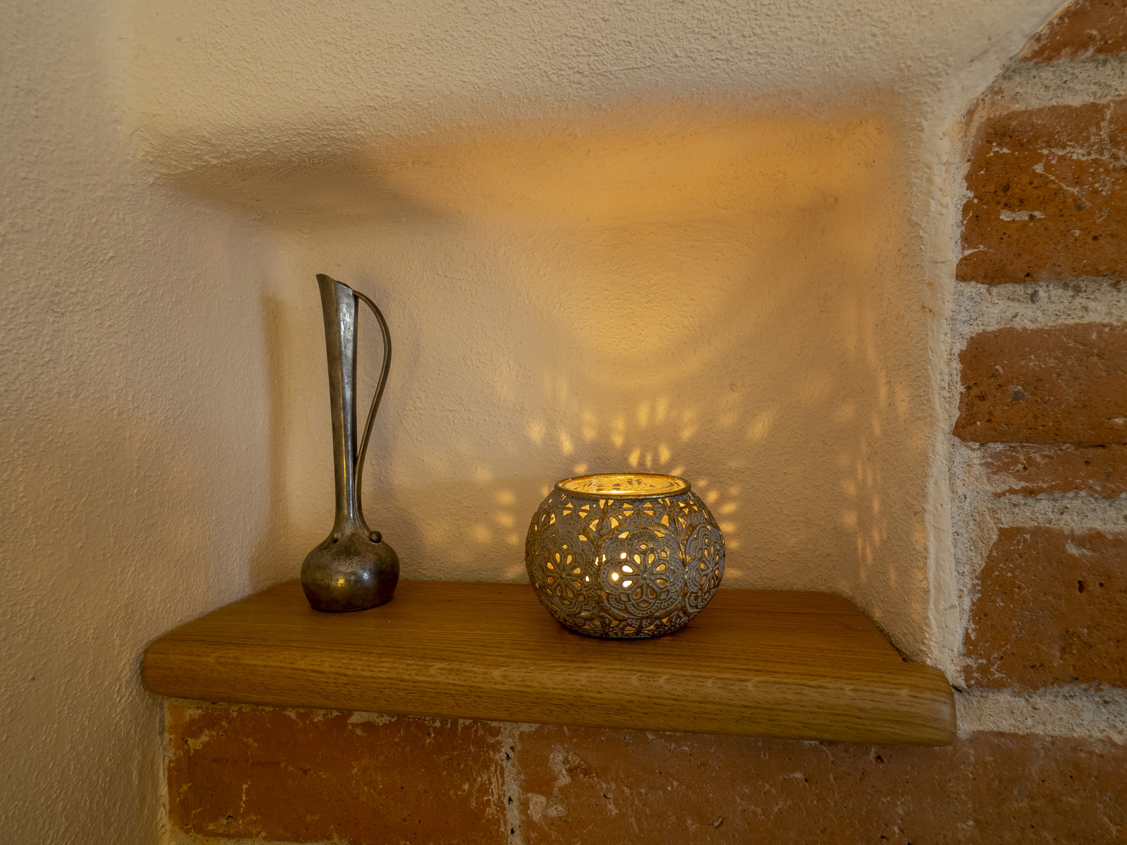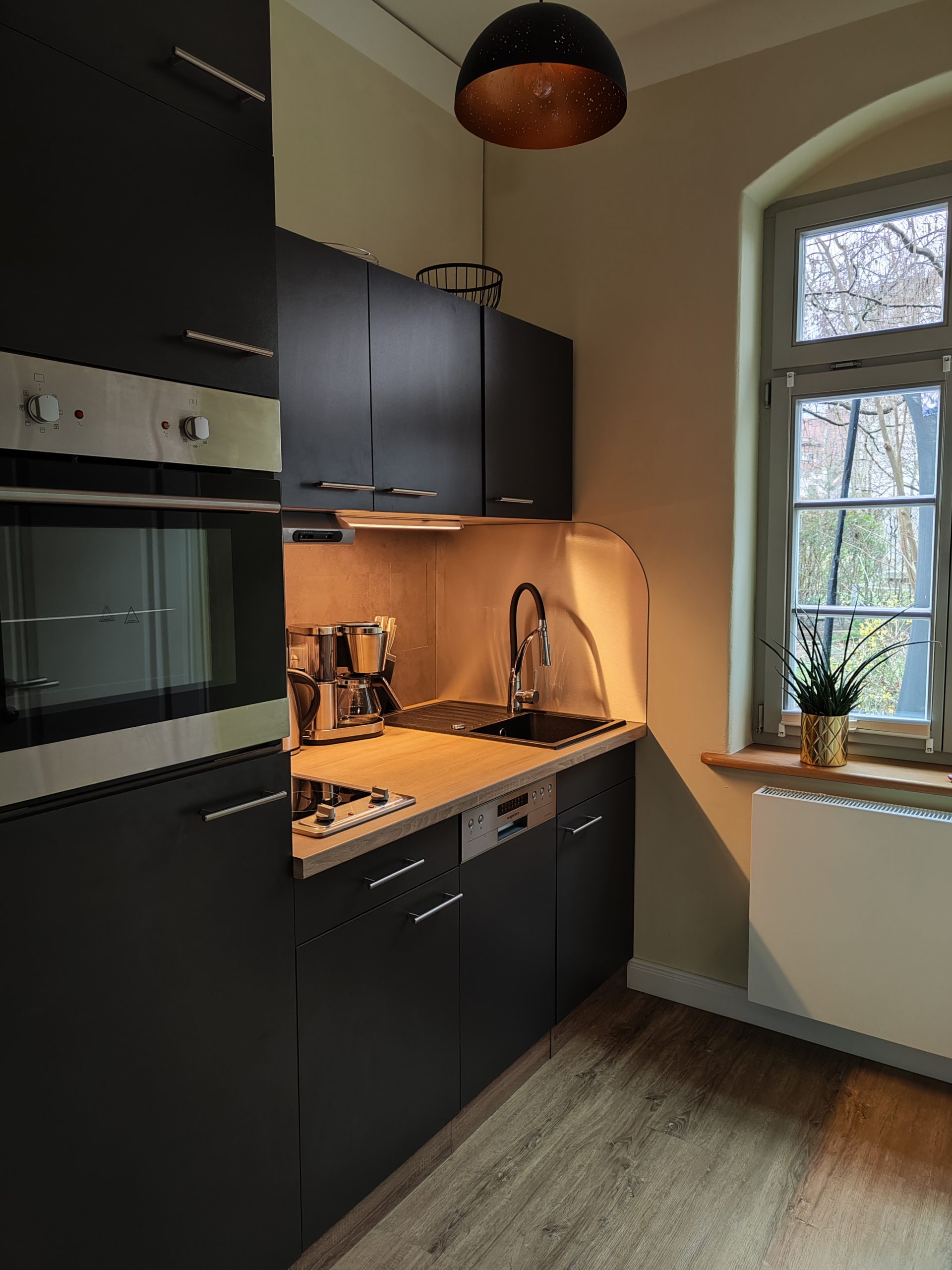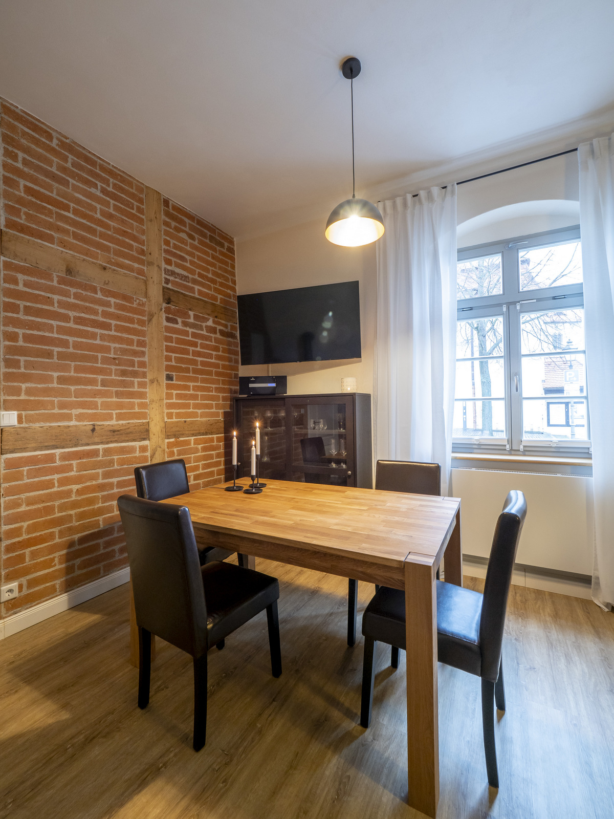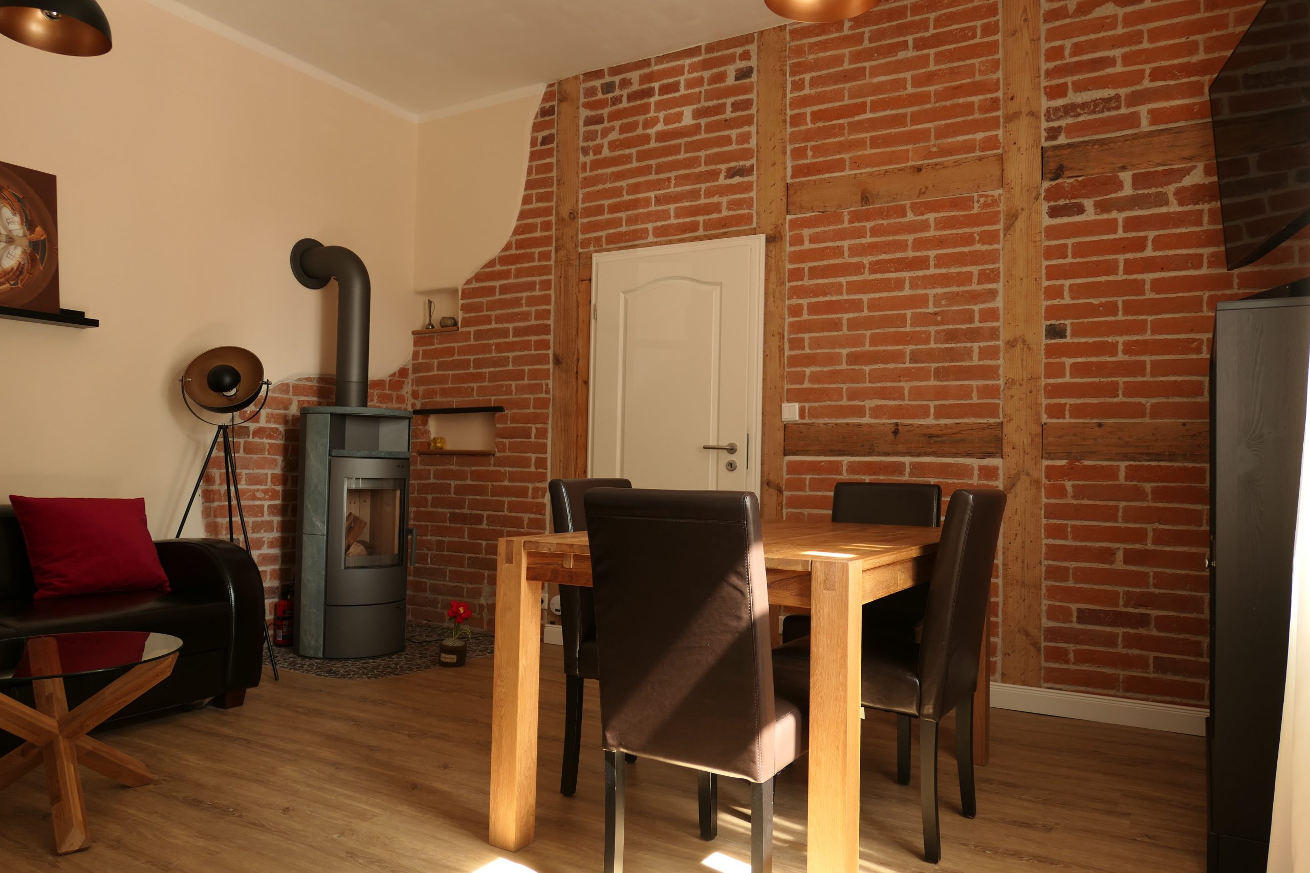 Die Ferienwohnung wurde Anfang 2022 fertiggestellt. Dabei wurde mit den verwendeten Materialien, wie Kalkputzen oder Holzfaserdämmung besonderer Wert auf ein gesundes Wohnklima gelegt. Die freigelegten historischen Fachwerkwände harmonieren mit der stilvollen Einrichtung aus Echtholzmöbeln und Leder. Besondere Akzente setzen handgefertigten Details aus schwarzem, mehrere tausend Jahre altem, Mooreichenholz aus der Elbe.