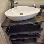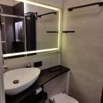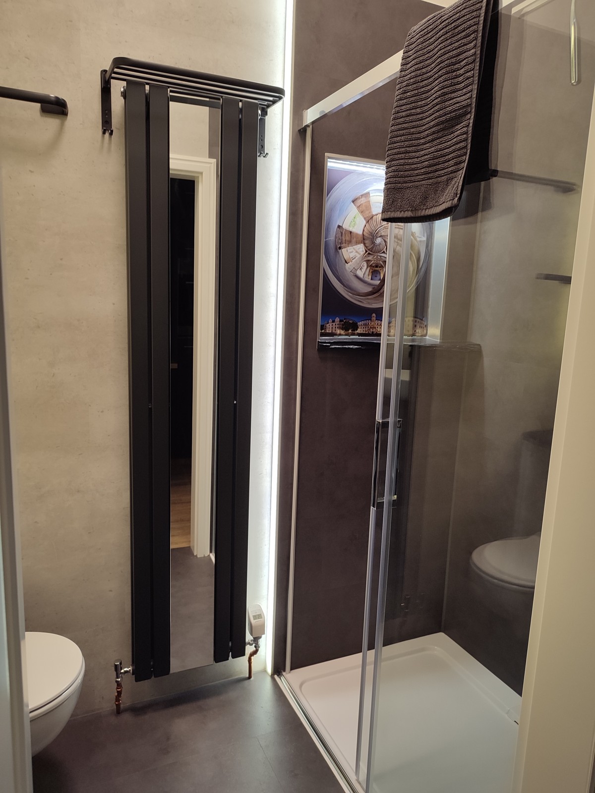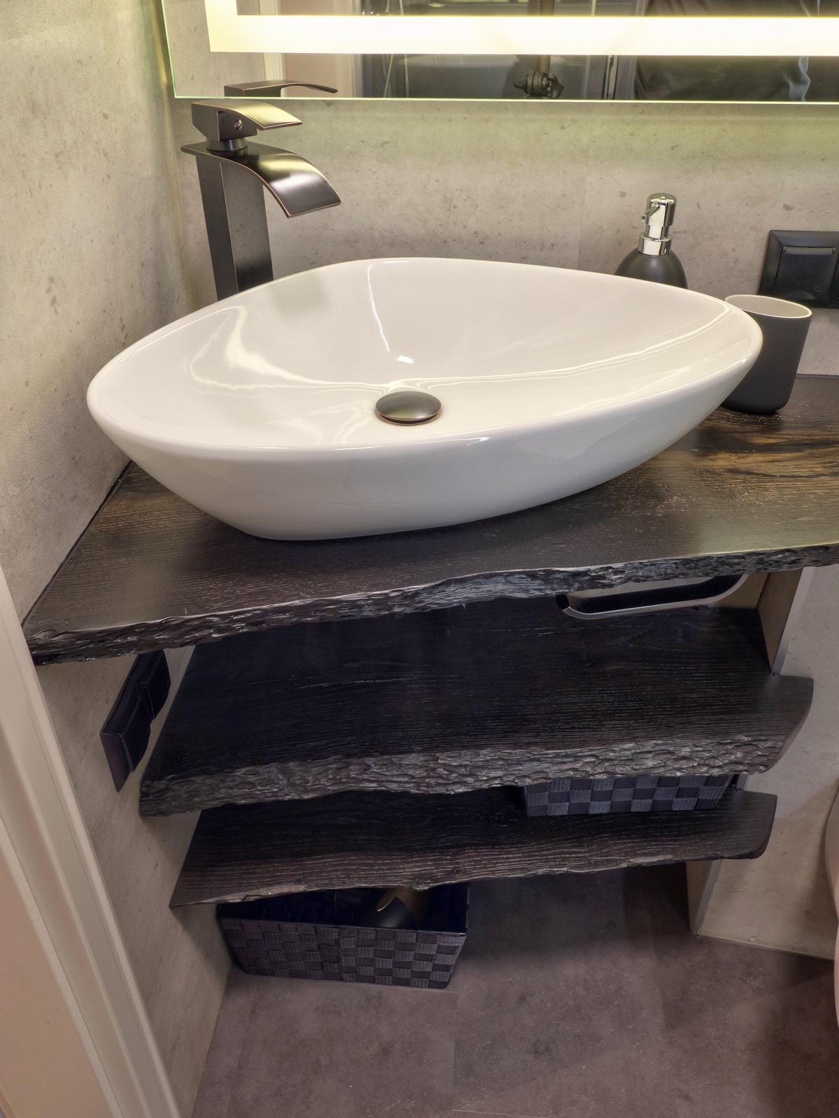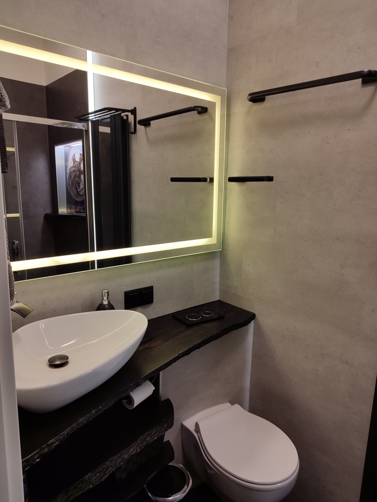 Das, mit liebevollen Details gestaltete Bad, beinhaltet eine großzügige, ebenerdige Dusche mit Thermostat u. Regendusche und einem „besonderen“ Blick auf den Wendelstein des Schlosses. Die Waschtischplatte mit einem Designwaschbecken, sowie die Ablagen sind handgefertigt aus mehrere tausend Jahre altem Mooreichenholz aus der Elbe. Ein Haarföhn, Handseife, Handdesinfektion und Handtücher stehen natürlich ebenfalls zur Verfügung.
