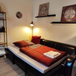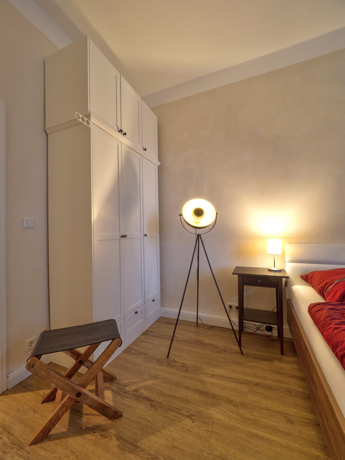 Der Schlafraum ist mit einem komfortablen Doppelbett 1,80 x 2,00 m (2 getrennte Federkernmatratzen), einem großen Kleiderschrank, 2 Nachtschränken und einem 43“ UHD TV mit Streamingdiensten (Wandbefestigung) eingerichtet.